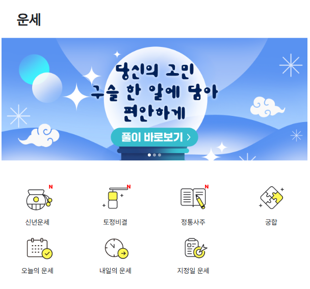 제가 테스트해본 운세는 오늘의 운세 / 연애운 / 금전운 / 궁합 이었어요.