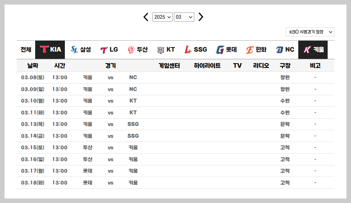 | 2025 KBO 기아 타이거즈 시범경기 예매&일정 (0) | 2025.02.21 |