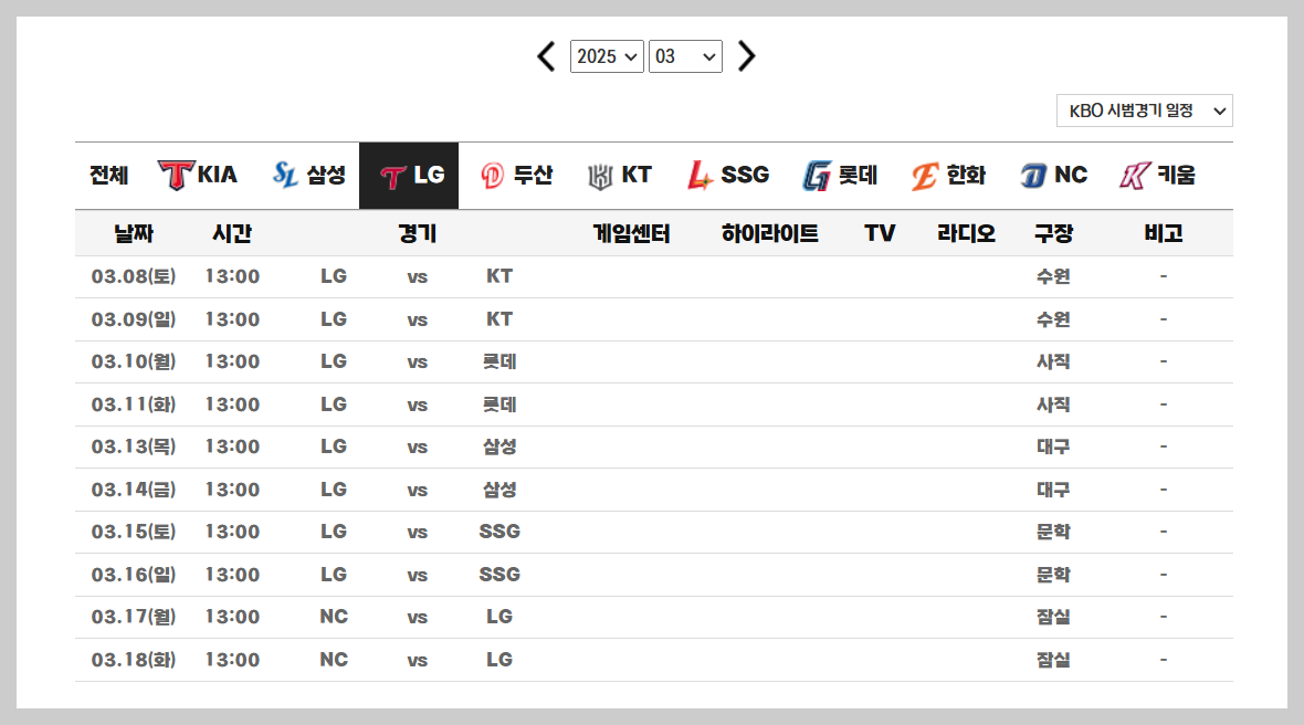 📢 시범경기 티켓은 보통 경기 1~2주 전에 오픈됩니다.